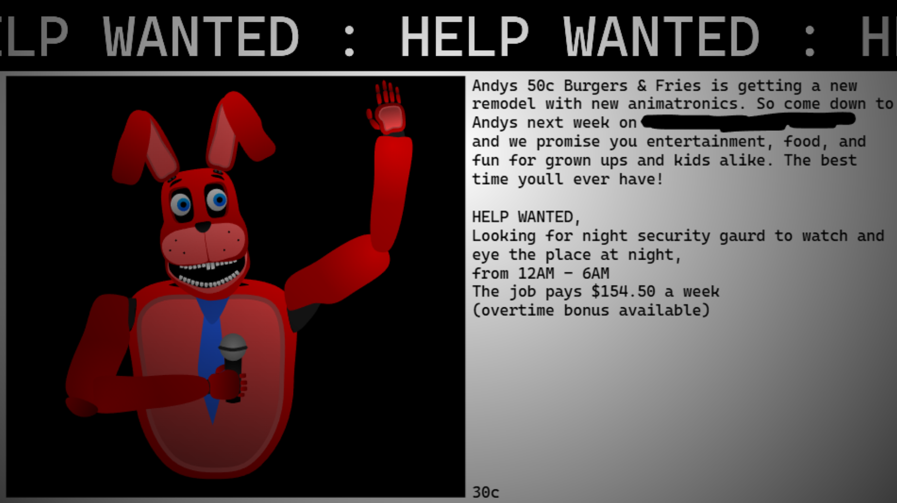 Andys 50c Burgers and Fries is opening to the public soon, and is in need of a night gaurd to watch the place at night. Are you fit for the job?